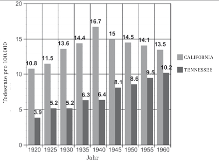 Abbildung 8: Allgemeine Brustkrebstodesraten der weißen US-Bevölkerung für Kalifornien (96 Prozent Elektrifizierung) und Tennessee (50 Prozent Elektrifizierung) pro Jahr.